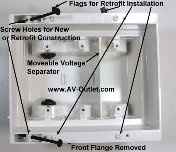 Arlington Industries DVFR2W, DVFR3W and DVFR4W recessed electrical boxes are the perfect space saver behind plasmas, LCD TV, or wherever you need to preserve space. The recessed outlet box allows for the power plug and AV connections to be set behind the surface of the sheetrock. The innovative design also allows for new construction or retrofit applications. The 2, 3 and 4 gang versions have a moveable divider so power and low voltage can be used in the same box. Maximize the efficiency of the DVFR box based on the particular application by moving the voltage divider to allocate more or less space for power or AV connections.