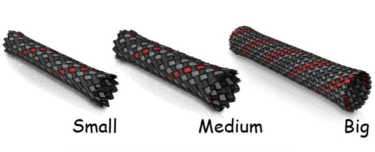 The ViaBlue "Race" braided sleeve, aside from the obvious aesthetic enhancements, helps protect cables against abrasion, bending and incident light radiation. The braided sleeve manufactured by ViaBlue is designed significantly differently than competing braided sleeves. The approach taken here provides nearly a one size fits all scenario. This is achieved by using expanding fabric fillers within the sleeve along with monofilaments. As the sleeve expands and contracts so does the fabric. This dramatically reduces the see through effect found in monofilament designs.