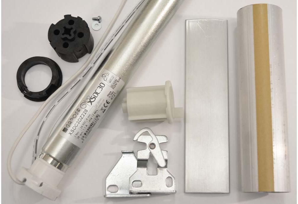 This shade motor kit includes everything you need to build a motorized roller shade except the fabric, remote control and power supply.