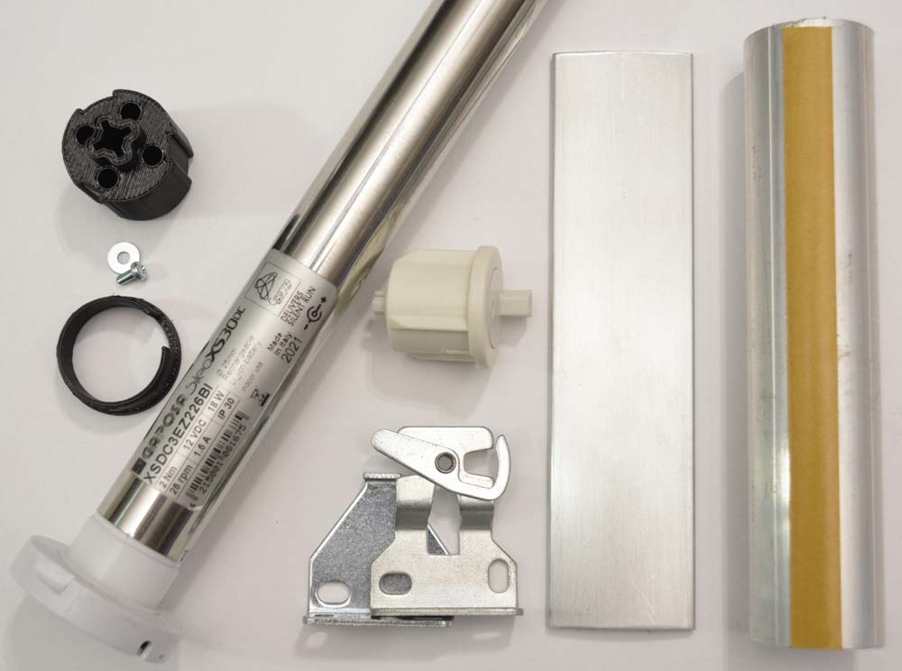This shade motor kit includes everything you need to build a motorized roller shade except the fabric, remote control and charger.