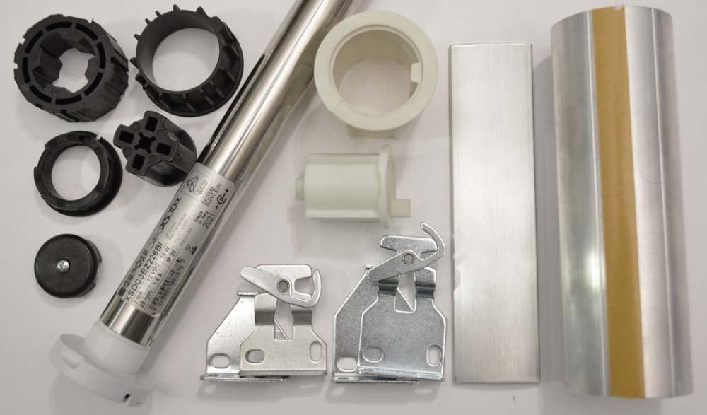 This shade motor kit includes everything you need to build a motorized roller shade except the fabric, remote control and power supply.