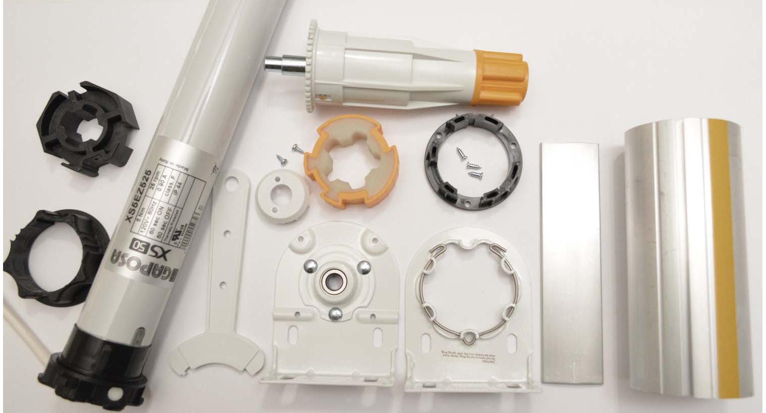 This shade motor kit includes everything you need to build a motorized roller shade except the fabric and remote control.