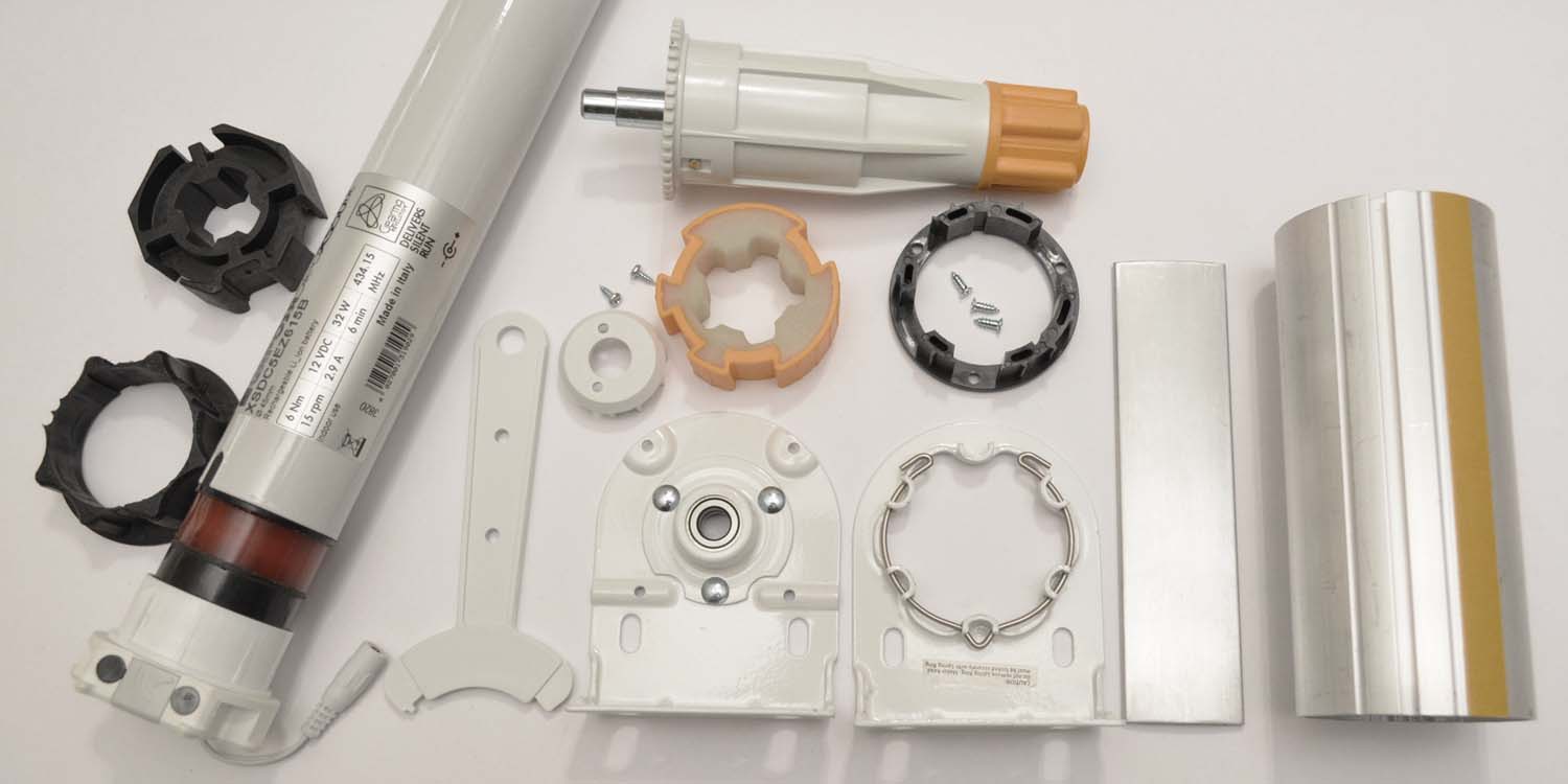 This shade motor kit includes everything you need to build a motorized roller shade except the fabric, remote control and charger.