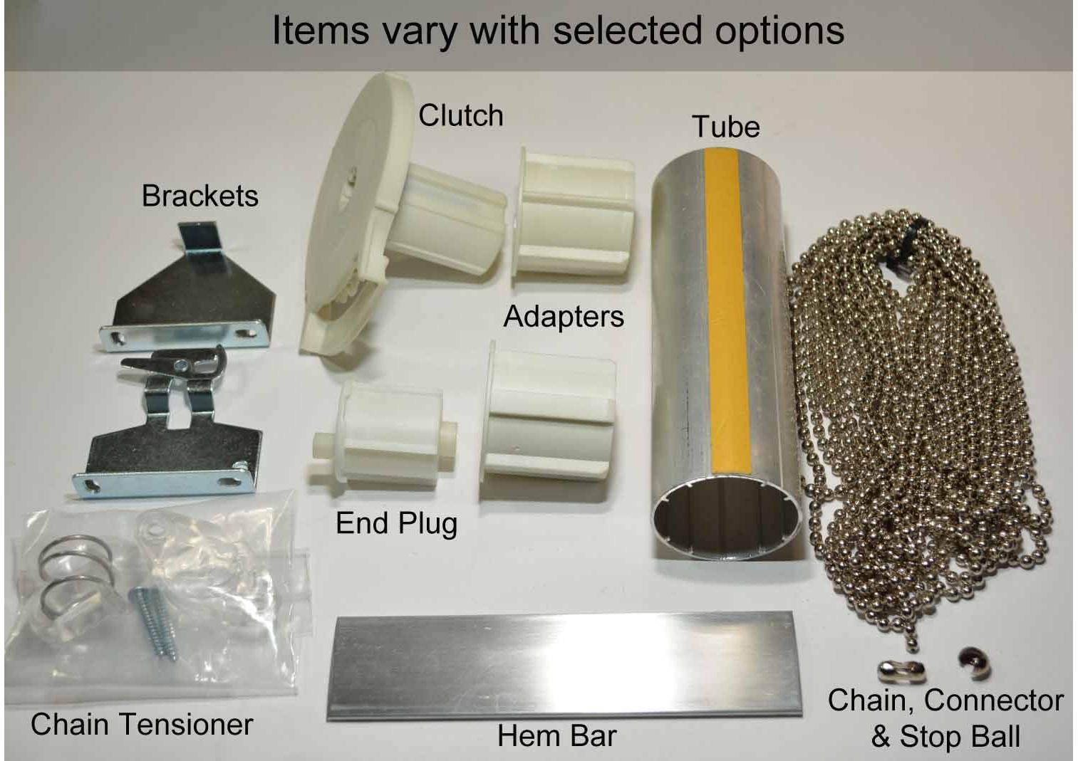 This shade clutch kit includes everything you need to build a manual chain pull roller shade except the fabric.