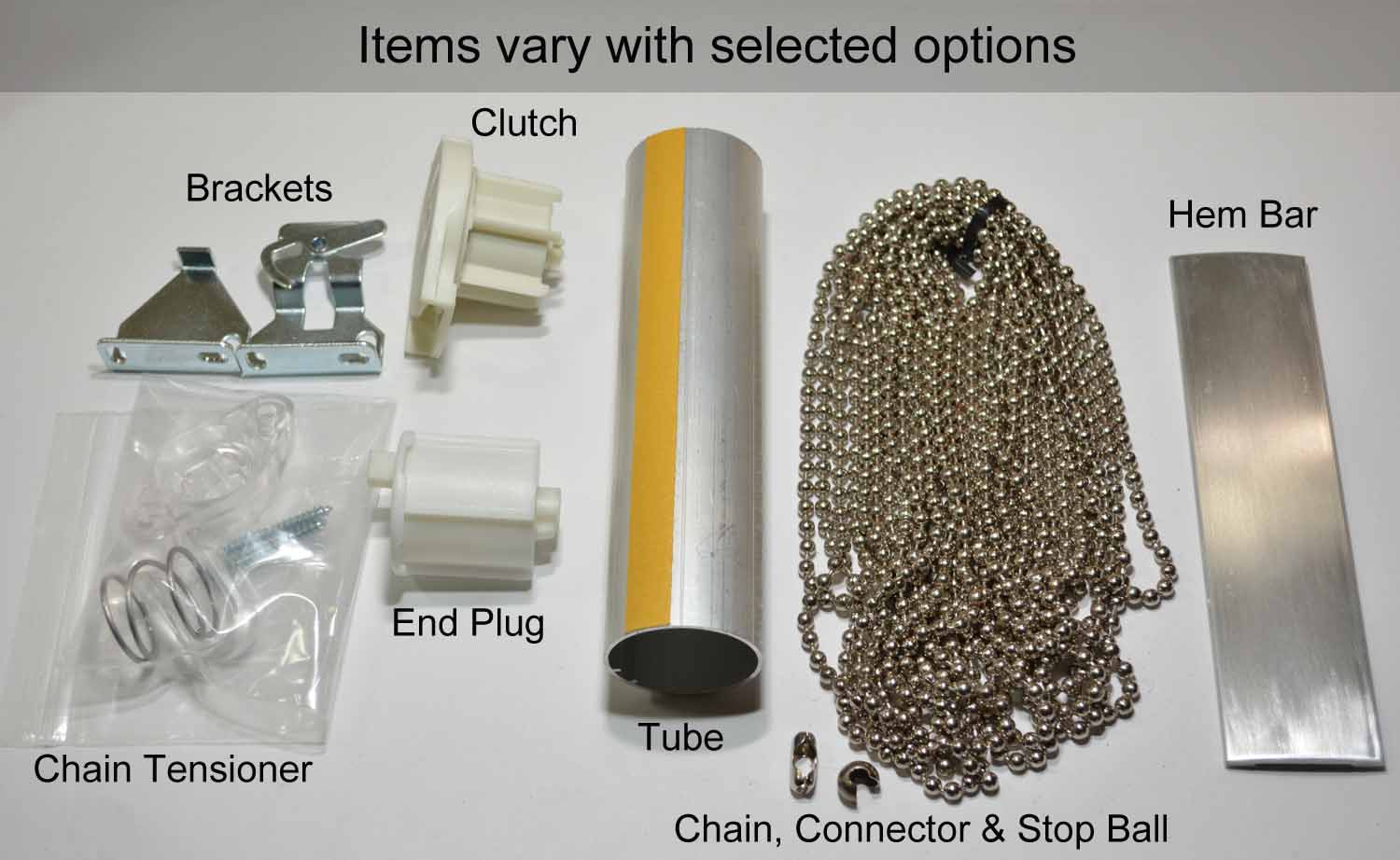 This shade clutch kit includes everything you need to build a manual chain pull roller shade except the fabric.