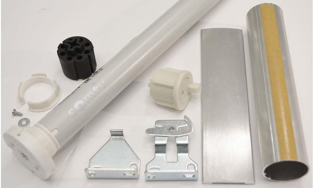 This shade motor kit includes everything you need to build a motorized roller shade except the fabric, remote control and power supply.